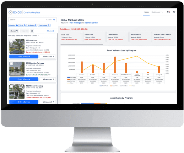 EXOS One Marketplace™ delivers transparency to efficiently manage and decide disposition paths of assets. This revolutionary asset decisioning tool complements servicers’ core operating systems and provides a new opportunity for automation, leveraging a proprietary mix of AI, machine learning, and data analysis while offering auction, property preservation, title, and closing services.